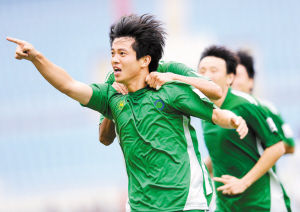 6月25日,深圳凤凰队球员文超(前)庆祝进球。(新 华)