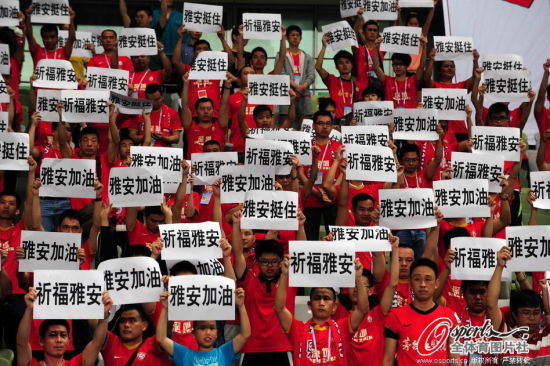 4月20日,在中甲联赛第6轮进行前,四川省雅安市芦山县发生7.0级地震,造成上百人伤亡。河南建业俱乐部联合河南足球事业发展基金会开展内部员工捐款,所得款项汇总球队捐款以及现场球迷捐款之后,由基金会捐给灾区相关部门,用于灾后重建。而在晚上进行的建业迎战哈尔滨毅腾队的比赛开始前,全场默哀三分钟,“四川加油!雅安加油!让我们为灾区祈福!”全场球迷点燃手中蜡烛为雅安祈福。
