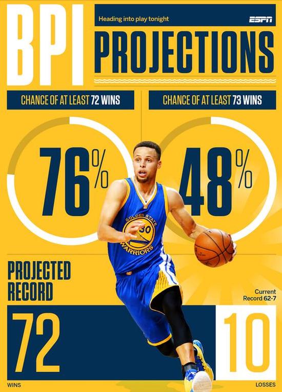 在经过BPI系统的运算之后,ESPN认为勇士取得72胜的概率达到了76%,而他们超越公牛,拿到73胜的概率也有48%。在BPI系统的预算下,勇士的最终战绩非常接近72胜10负。