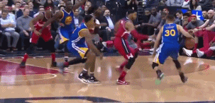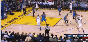杜兰特防守库里,可以看出在最开始,他就已经做出扑出去封投篮的准备了。库里向左路佯攻,然后一个隐蔽的背后运球转向右路。过掉杜兰特后,两步之内没人,一个挑篮轻松打进。