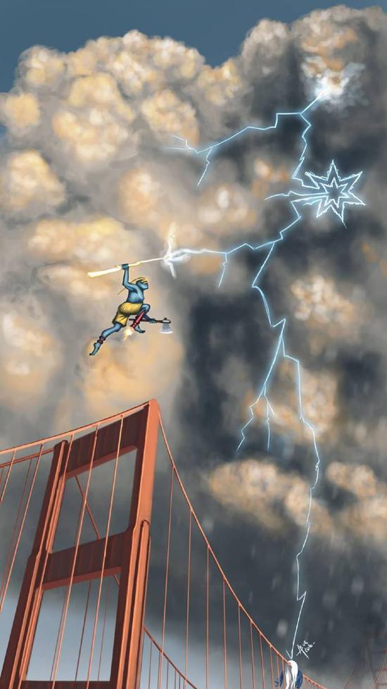 一位勇士脚踏火箭,跳向天空,握住闪电,意用手中的斧头去劈砍。值得一提的是,勇士手中的斧头正是上一组漫画中开拓者手中的,这也代表着勇士刚刚淘汰了开拓者,这把斧头就是战利品。而闪电的下端,有一匹已经被劈死的马,在马的下方还有一头牛,说明雷霆在之前两轮分别淘汰了马刺和小牛。