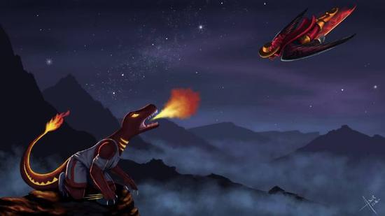 一只恶龙趴着山上,脚下踩着步行者(那是步行者的logo),嘴中喷着怒火,这代表着猛龙在上一轮刚刚淘汰热火。而不远处的天空飞来一个人,那是带着老鹰双翼的骑士,这代表着骑士在上一轮淘汰了老鹰,而他们手中,还持着活塞的利剑。