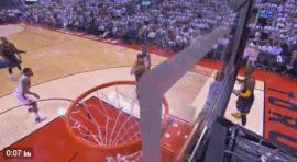 第三节打到6分53秒,勒夫和詹姆斯两人配合,从左侧45度角空切篮下接到后者传球,连续两球没有打成的他看起来也是想要好好发泄一下,这球起来直接就奔着爆扣去了,结果被守在篮下的比永博正面硬生生地按了下来,反倒让对方士气大振。