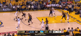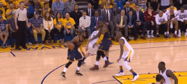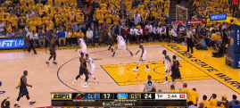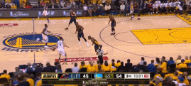 第一节1分54秒,库里从另一侧兜底线到这一侧接球,汤普森跟了他跑了半个地球,到了这边,库里接到球之后,还是让JR和汤普森夹击了库里。