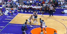 但是,一旦区域联防成为合法的防守方式,防守选择就不再是非此即彼了。防守球员可以不用盯防任何人而在油漆区里站满三秒,假装要制造包夹,但不必真去包夹。这就让奥尼尔过去一个人独占的空间变得拥挤起来。如今,像奥尼尔这样的内线球员不仅要对付自己的对位防守人,还要对付一两个在协防位置上蠢蠢欲动的对方球员。