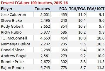 卢比奥和隆多这两名优秀的控卫,也在这份榜单之中,两人的每百次触球中投篮出手次数分别只有9.8次和11.5次,作为对比,勇士队汤普森和科比的这项数据分别为36.6次和36.5次。另一项值得一提的数据是,隆多上赛季的触球总次数高达6745次,而科比的触球总次数3052次,尚不如隆多的一半;上赛季效力于雷霆的迪昂-维特斯的触球次数只有2344次,投篮出手次数却与隆多相差无几。