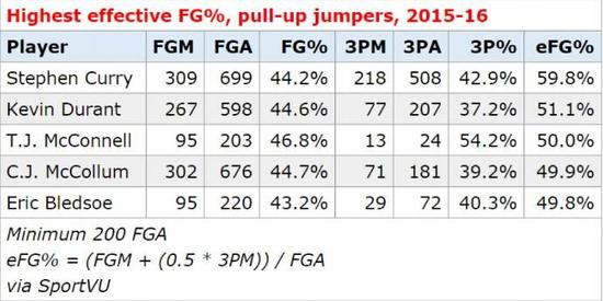 而且两人的投篮范围还是互补的——库里上赛季有73%的干拔跳投出现在三分线外,他的投篮数比任何人都多,超过第二名多达85个。而杜兰特大部分的干拔跳投则出现在三秒区内,比例是65%,而杜兰特的中距离(三秒区和三分线之间的区域)干拔跳投命中率达到了惊人的49.5%,是所有(出手200次以上,共86人)球员中最高的,他的新队友大卫-韦斯特则排名第三。