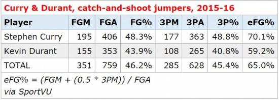 更奇葩的是,库里和杜兰特都是那种接球投篮比运球投篮更准的人。库里的接球投篮命中率是48.3%,三分命中率是48.8%,有效命中率是70.1%;而杜兰特命中率是43.9%,三分命中率是40.8%,有效命中率是59.2%,两人的综合有效命中率是惊人的65%。考虑到杜兰特加盟勇士后,两人必将得到大量空当接球的机会,这个成绩的转化率将是非常恐怖的。