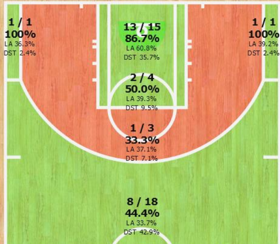 上面这张图是书豪6场比赛过后的投篮分布图和命中率情况,就像我们前面说的,绿色部分反映的是球员命中超过联盟均值的投篮点。可以看出,书豪不仅保持了自己在禁区终结时的超高命中率,他的三分球能力也得到了显著的提高,三分线外所有位置的命中率都高于联盟的平均值。