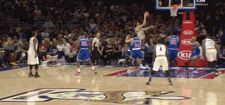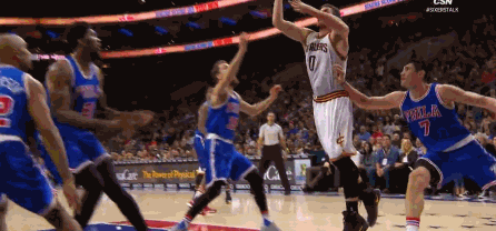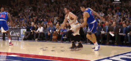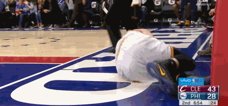 当时勒夫左侧底线接球,趁对手绕前失败留出的空挡只杀篮下,不过在另一侧,乔尔-恩比德第一时间补过来试图封盖,两个人在空中猛烈相撞,虽然勒夫凭借手腕的控制将球打中,但却在身体接触后失去重心被对方直接撞翻在地。