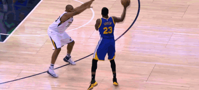 这一幕出现在第三节8分19秒。勇士进攻回合,德雷蒙德-格林在强侧三分线外传到另一侧45度角,杜兰特接球后,在右手被勾住的情况下,下意识地跃起用左手将球一抛,意图造犯规,而裁判哨声也响起,并指向约翰逊。