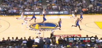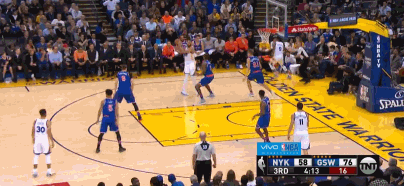 下半场汤普森延续着强势发挥,个人进攻欲望让他得到了很多出手投篮机会。第三节7分45秒,库里运球过半场,从右侧四十五度一个横传球给汤普森助攻,后者张手命中一记三分。随后汤普森空切篮下,麦基脑后传球助攻汤神,后者强起将球打进的同时造成李的犯规。