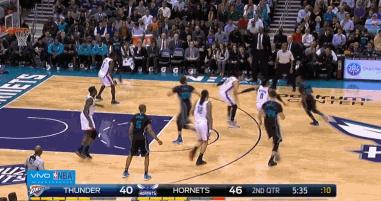当时肯巴-沃克投篮不中,威少抢到后场篮板之后想在半场结束前抢一个2+1,所以运球到前场之后,直接就是一记干拔三分。只不过今天威少手感冰冷,这一球直接砸前沿儿弹飞,可就在其他人还在愣神儿的功夫,威少已经箭一般窜了出去,自投自抢,在底线附近,高难度后仰跳投命中。