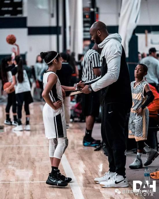 今天,湖人名宿科比-布莱恩特在场边向二女儿面授机宜的一组照片曝光。