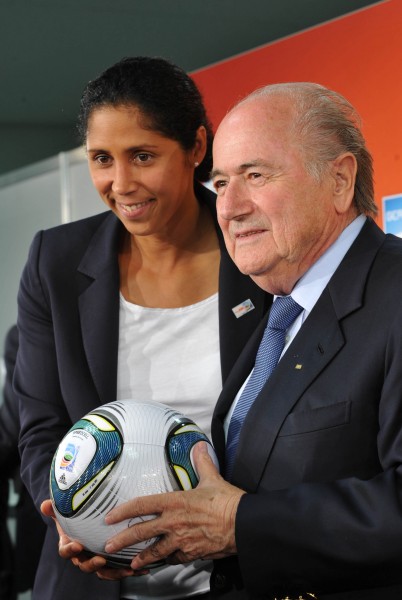 6月25日,国际足联主席布拉特(右)与2011年德国女足世界杯组委会主席琼斯在新闻发布会后合影。当日,2011年国际足联女子足球世界杯新闻发布会在德国柏林奥林匹亚体育场举行。国际足联主席布拉特、国际足联副主席马库迪、2011年女足世界杯组委会主席琼斯和国际足联女足事务负责人哈恩妮出席了新闻发布会。2011年国际足联女子足球世界杯将于26日开幕。