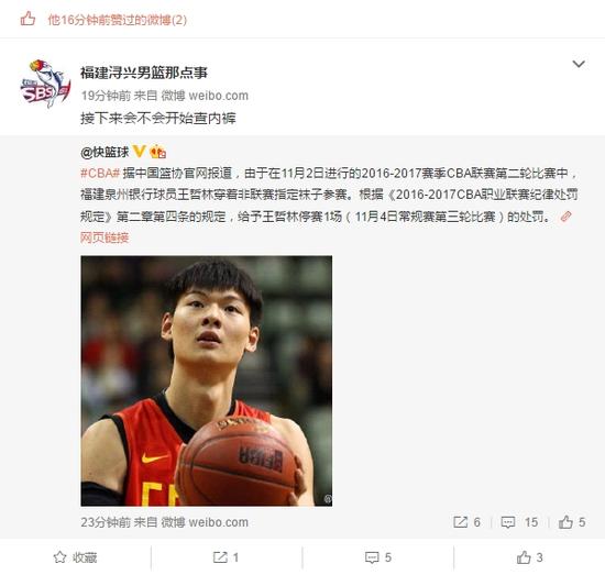 有趣的是,有个名为福建浔兴男篮那点事的微博账号,转发了王哲林禁赛的新闻微博,并吐槽称“接下来会不会开始查内裤?”王哲林还在这条微博下点了一个赞。