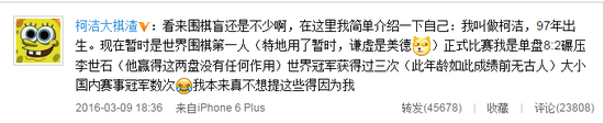 然而,其微博昵称“柯洁大棋渣”也遭到部分网友的吐槽,为此,他还专门发微博介绍自己:“看来围棋盲还是不少啊,在这里我简单介绍一下自己:我叫做柯洁,97年出生。现在暂时是世界围棋第一人(特地用了暂时,谦虚是美德)正式比赛我是单盘8:2碾压李世石(他赢得这两盘没有任何作用)世界冠军获得过三次(此年龄如此成绩前无古人)大小国内赛事冠军数次,我本来真不想提这些得因为我是一个低调的人,是你们逼我的。
