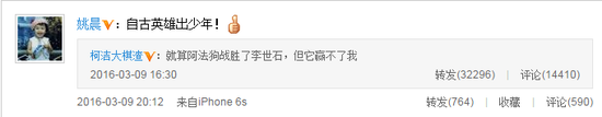 而在这场大战背后,一名中国围棋高手的名字却被频繁提及,那就是排名世界第一的围棋选手柯洁,他的微博不但得到了“女神”姚晨的转发,粉丝也从1万涨到了21万。
