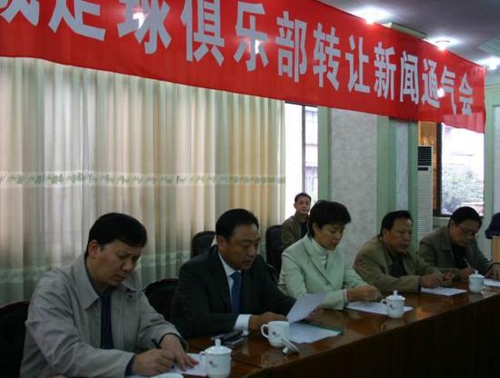 (2005年11月8日,四川冠城足球俱乐部在成都召开新闻通气会,宣布从即日起正式转让俱乐部,价格面议。新华社记者刘海摄)