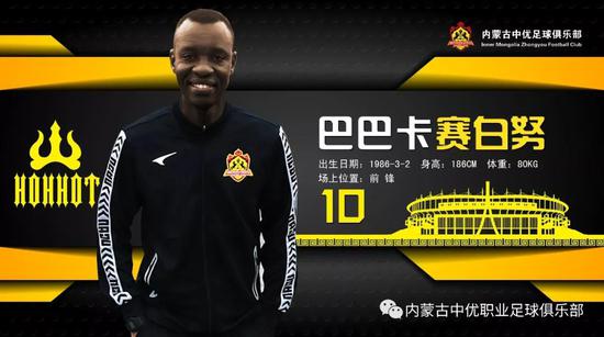 巴巴卡·古耶(Babacar Guèye),塞内加尔、法国双国籍,出生于1986年3月2日,身高186cm,体重80kg,司职前锋,是一名进球效率极高的前场王者。曾效力于深圳、新疆、黑龙江等多支中国联赛球队,是第一个达成中国联赛百球成就的外援,2012、2013赛季,巴巴卡连续两个赛季夺得中甲联赛金靴。2018赛季,巴巴卡为黑龙江FC队在联赛中出场25次,打进14粒进球,并且凭借180次的空中争顶次数在中甲联赛所有球员中排名第10位,新赛季巴巴卡将和桑戈尔组成全新的“塞内加尔双塔”为球队冲锋陷阵。值得一提的是,2015赛季桑戈尔和巴巴卡就是深圳队锋线上的搭档,相信此次两人在呼和浩特重逢将会摩擦出更大的火花,为球队夺取更多的胜利!