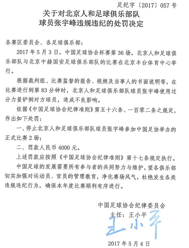 人和大将因铲人力量过大 遭禁赛两场+罚款四千 2017年05月06日17:54 新浪体育 微博 分享 新浪微博 微信 腾讯QQ QQ空间 | 评论 足协开出罚单 5月6日,中国足协下发罚单,在足协杯第三轮北京人和与北京国安比赛过程中,人和球员张宇峰因使用过分力量铲人被足协禁赛两场罚款四千。 标签: 人和罚款力量张宇峰足协杯 相关阅读: 加载中,请稍候...