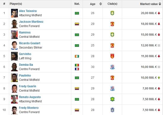 中超球员身价TOP10而中国球员中,身价最高的是广州恒大后卫张琳芃,他的估价为120万欧,排在整个中超球员榜单的第40位,比起上一期100万欧元的估价有所上升。上海上港前锋武磊则以100万欧的身价排名第44位,排名中国球员第二;北京国安中场张稀哲则以90万欧排名第50位,中国球员第三。