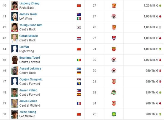 张琳芃、武磊、张稀哲分别排在榜单40-50位之间(新体)