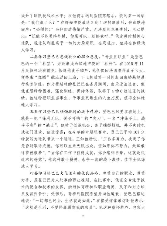 新浪体育讯 北京时间7月27日消息,在7月17日的上海德比中,申花球员登巴巴遭遇重伤,左小腿胫骨、腓骨骨折,无缘本赛季剩余比赛,7月22日登巴巴在上海成功完成手术。今天上海绿地集团在集团范围内开展向登巴巴学习的活动,学习登巴巴的五大品质:一、学习登巴巴团队协作的大局意识;二、学习登巴巴忠诚敬业的职业态度;三、学习登巴巴顽强拼搏的战斗精神;四、学习登巴巴大气谦和的优良品格;五、学习登巴巴乐观向上的精神信念。