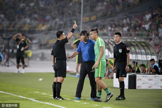 绿城球员向裁判抗议新浪体育讯 北京时间7月29日晚,2016年中超联赛第20轮,依靠张稀哲的进球,北京国安主场1-0战胜杭州绿城,本场比赛最后时刻主裁判石祯禄红牌罚下绿城球员葛振,这一争议判罚引发绿城教练组非常不满,而石祯禄第50分钟还给替补席的张呈栋一张黄牌,也让人非常摸不着头脑。