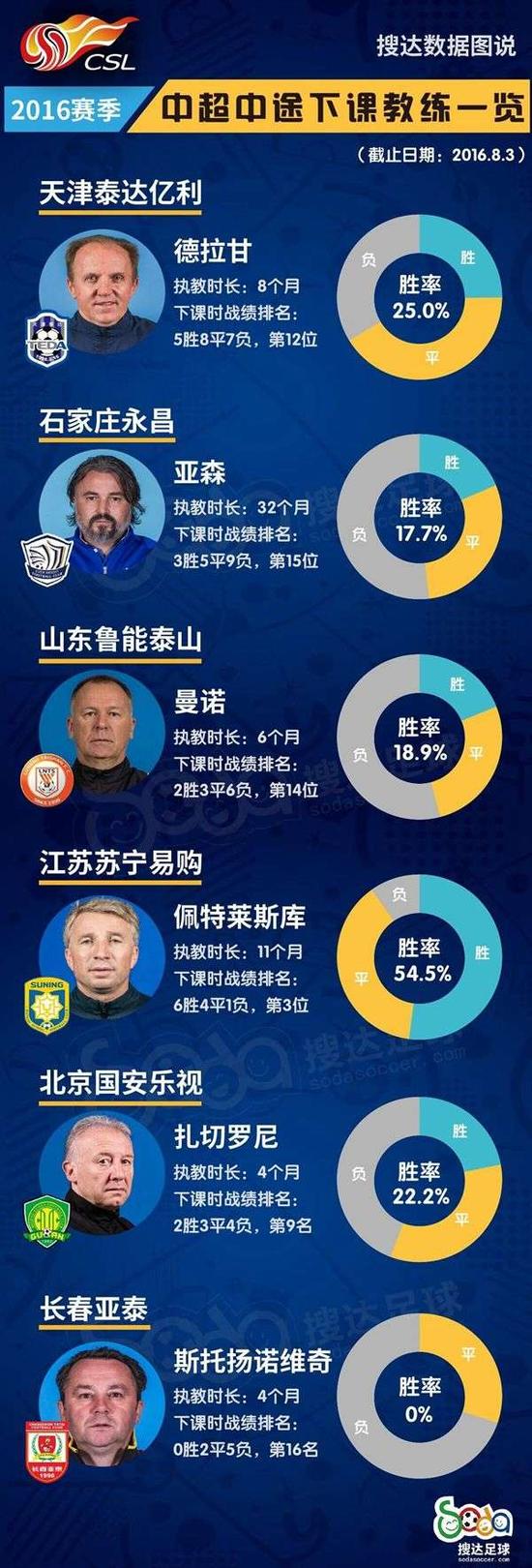 从第8轮赛后下课的斯托扬诺维奇到上一轮后下课的德拉甘,本赛季中超2/3赛程过去,已经先后有6支球队更换了主教练,占比超过1/3。这6位下课的主教练中,执教时间最长的是亚森,执教石家庄永昌达32个月;带队战绩最好的是佩特莱斯库,胜率为54.5%。更多详细数据及对比请看下图: