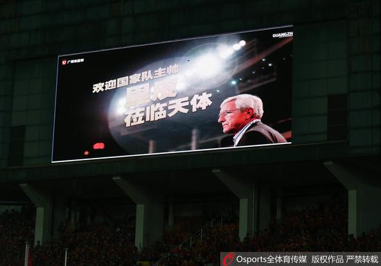 里皮出现在看台后,天河体育场的大屏幕也放出了一副巨幅海报欢迎里皮来到天河,海报中写道:欢迎国家队主帅里皮莅临天体。恒大球迷得知里皮来到现场后也为这位功勋老帅献上了热烈的掌声。(新体)
