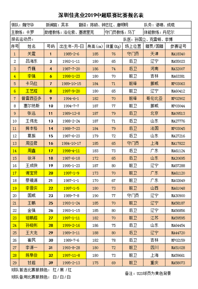 2019赛季深圳中超报名表;前中超冠军引援以稳为主