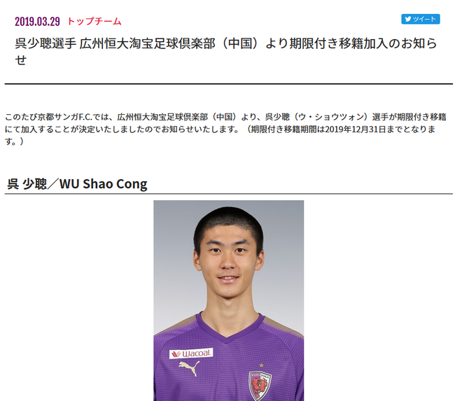 北京时间3月29日,日本J2联赛球队京都不死鸟宣布,恒大球员吴少聪租借加盟,租期直到2019年12月31日。