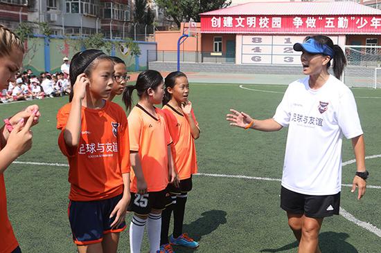 中国女足前国脚张鸥影给中美青少年进行足球培训。