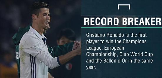C罗也成为足坛历史上第一位在同一年赢得欧冠、欧洲杯、世俱杯以及金球奖的球员。