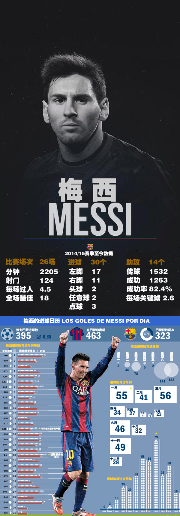 西甲26轮过后(截至3月11日),梅西在射手榜上完成了对C罗的迫近,目前两人同进30球并列第一。今年是梅西效力巴萨的第十个年头,十年间梅西总共为巴萨出场463次打进395个进球,而如果我们以自然月的单日来统计的话,会发现梅西的进球遍布于一个月中每一天,也就是说从1日到31日,他都有进球。实际上不仅如此,每个自然月,自然周的每一天,梅西都有过破门记录,下面我们不妨就来看看“梅西的进球日历”。