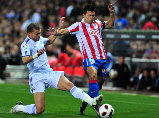 3月19日,马德里竞技队球员阿圭罗(右)在比赛中被皇家马德里队球员佩佩阻截。当日,在2010/2011赛季西班牙足球甲级联赛第二十九轮比赛中,马德里竞技队主场以1比2不敌皇家马德里队。