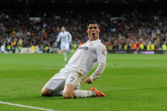 新浪体育讯 北京时间4月15日,西甲一场焦点战,皇马主场3-1希洪竞技队,伊瓜因、C罗及本泽马各进一球。图为C罗滑铲庆祝破门。