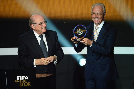 新浪体育讯 北京时间1月8日2时,国际足联2012年度颁奖大典在苏黎世举行。梅西荣膺金球奖,博斯克当选最佳男足教练,11名西甲球员垄断年度最佳阵容。费内巴切球星施托奇夺得最佳进球奖项。奥运冠军美国则包揽女足两大奖项。图为贝肯鲍尔荣获主席特别奖。