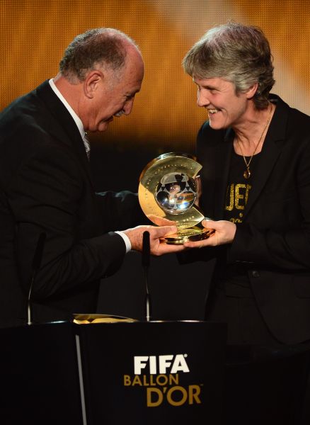 新浪体育讯 北京时间1月8日2时,国际足联2012年度颁奖大典在苏黎世举行。梅西荣膺金球奖,博斯克当选最佳男足教练,11名西甲球员垄断年度最佳阵容。费内巴切球星施托奇夺得最佳进球奖项。奥运冠军美国则包揽女足两大奖项。图为斯科拉里为皮娅颁奖。