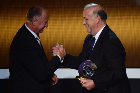 新浪体育讯 北京时间1月8日2时,国际足联2012年度颁奖大典在苏黎世举行。梅西荣膺金球奖,博斯克当选最佳男足教练,11名西甲球员垄断年度最佳阵容。费内巴切球星施托奇夺得最佳进球奖项。奥运冠军美国则包揽女足两大奖项。图为斯科拉里为博斯克颁奖。