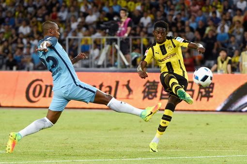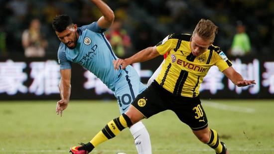 阿圭罗破门瞬间新浪体育讯 北京时间7月28日19时30分,国际冠军杯在深圳龙岗体育中心开始1场较量,曼城90分钟与多特蒙德战为1比1平,并在点球大战中6比5胜出。上半时结束前,伊赫纳乔近射被扑出。下半时,卡斯特罗单刀打高。席尔瓦助攻阿圭罗破门。诺利托替补出场完成首秀。补时阶段,香川真司助攻普利西奇扳平。点球战进行8轮,曼城替补门将古恩扑出3个点球。