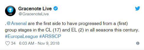 据统计,阿森纳是20世纪唯一一支每个赛季都从(第一轮)欧冠(17次)小组赛和欧联小组赛(2次)出线的球队。