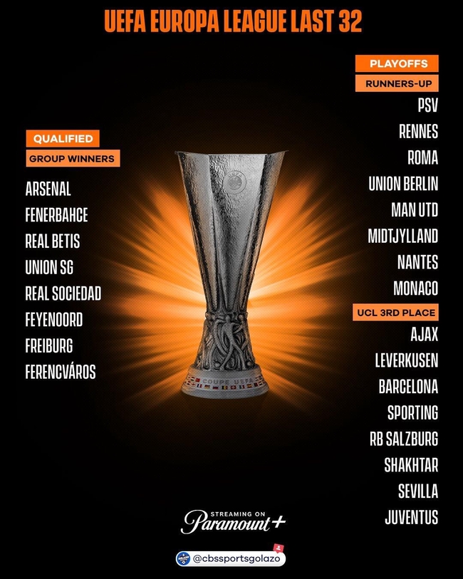 欧联杯小组第二将作为种子队参加附加赛,他们是埃因霍温(荷甲)、雷恩(法甲)、罗马(意甲)、柏林联合(德甲)、曼联(英超)、中日德兰(丹超)、南特(法甲)、摩纳哥(法甲)。