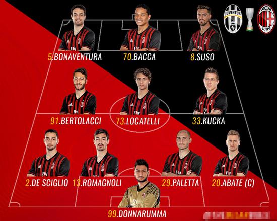 AC米兰(4-3-3):99-唐纳鲁马/20-阿巴特,29-帕莱塔,13-罗马尼奥利,2-德希利奥/33-库茨卡,73-洛卡特利,91-贝尔托拉奇/8-苏索,70-巴卡,5-博纳文图拉