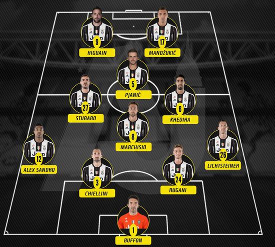 尤文图斯(4-3-1-2):1-布冯/26-利希施泰纳,24-鲁加尼,3-基耶利尼,12-阿莱士-桑德罗/6-赫迪拉,8-马尔基西奥,27-斯图拉罗/5-皮亚尼奇/9-伊瓜因,17-曼朱基奇