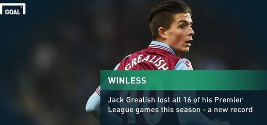 维拉小将格拉利什(Jack Grealish)在本赛季出场的全部16场比赛中未尝胜绩。根据外国媒体的统计,这一数据也创造了一项新的纪录。