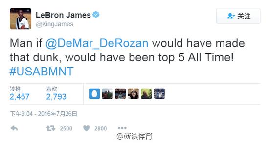 德罗赞360度隔人暴扣!惊呆了!!就差一点!詹皇都忍不住发推感叹道:“如果德罗赞把这球扣进了,绝对能进历史五大!