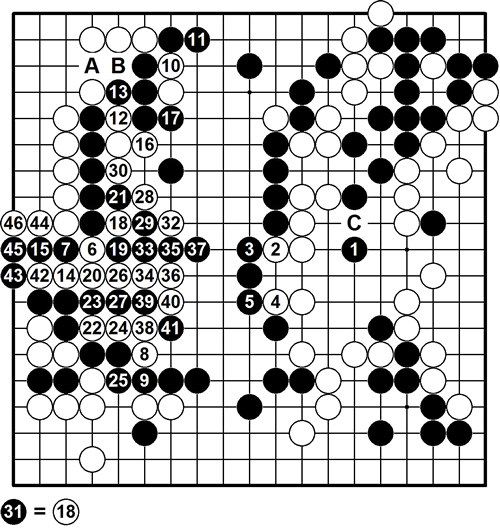 复盘时,李世石提出,黑1不跳,改在A位挖,白B,黑13,防住白棋在12位退的手段,白棋将不在左上角应,而是在C位封住黑棋,那样经过古力九段和俞斌九段的演算,黑棋不出差错的话,将是半目胜的概率大。
