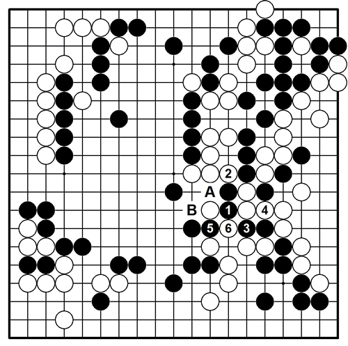 超级误算图二(变化图),李世石在右边盘到底出现了怎样的误算,导致局面瞬间崩溃呢?他以为黑1冲,白2断,黑3打吃后可以在5位连回黑子,这样就将白棋断成两块,黑棋赢定。但黑5冲时,白6将黑3两子提掉了!黑棋也不可能在A位冲出。惊觉漏算后,黑1只得在2位粘,白B位双后,黑棋已经慢了一手棋。★霜仁